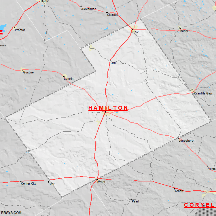 Hamilton County, TX (shown in white) has 835.91 mi² of land area and 0.48 mi² of water resources. The county is bordered by: