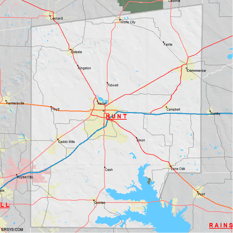 The estimated population of Hunt County is 116,151 with 41,703 households. These households are spread across 12 unique municipalties (not all shown).
