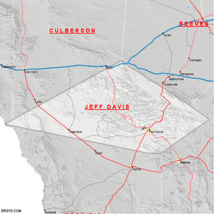 Jeff Davis County, TX (shown in white) has 2,264.56 mi² of land area and 0.08 mi² of water resources. The county is bordered by: