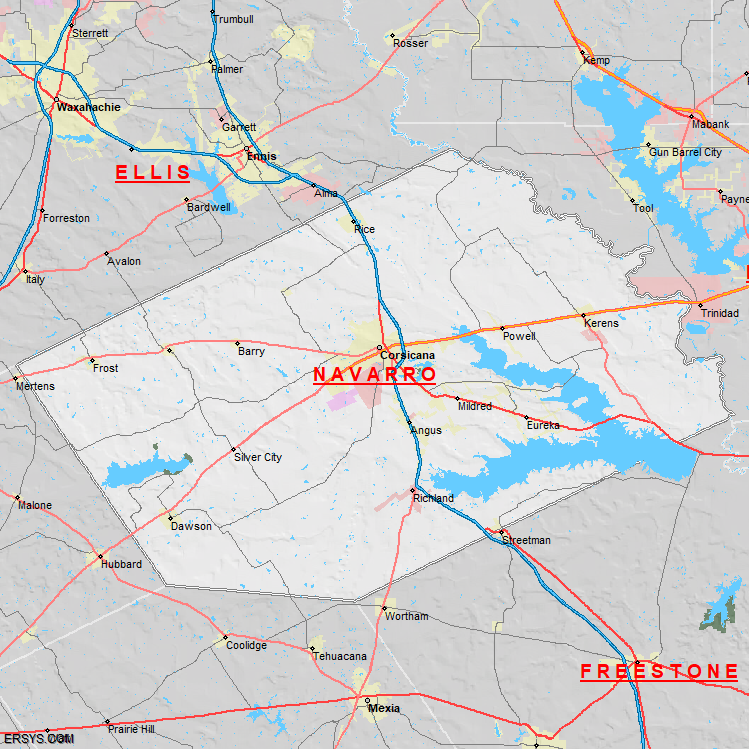 Navarro County, TX (shown in white) has 1,009.7 mi² of land area and 76.3 mi² of water resources. The county is bordered by: