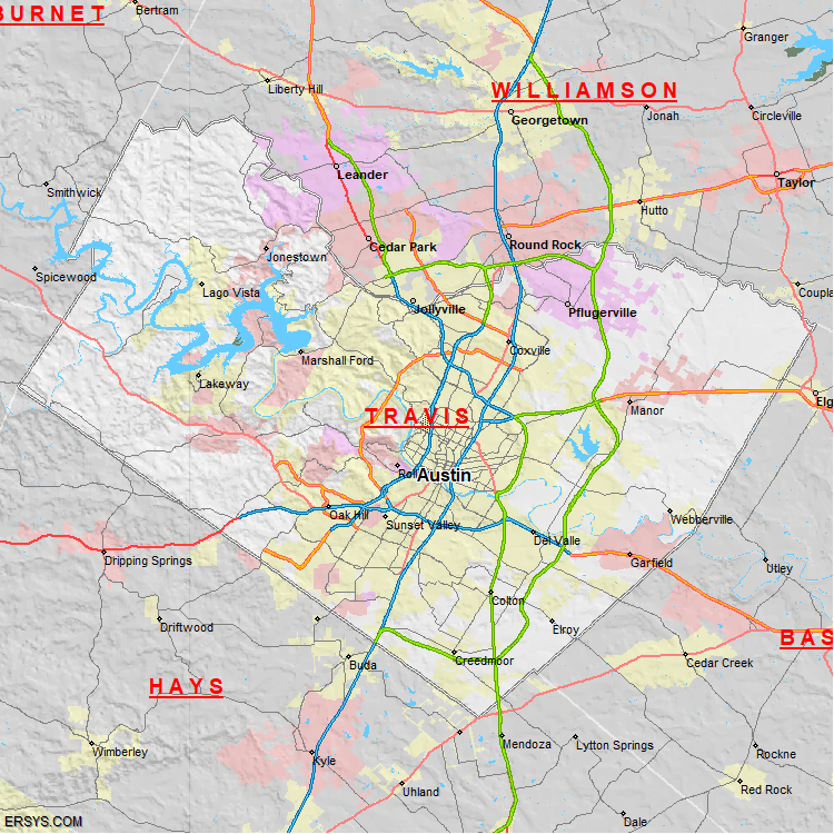 Travis County, TX (shown in white) has 994.29 mi² of land area and 30.73 mi² of water resources. The county is bordered by: