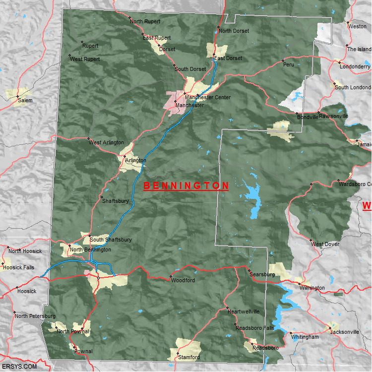 Bennington County, VT (shown in white) has 674.24 mi² of land area and 2.66 mi² of water resources. The county is bordered by: