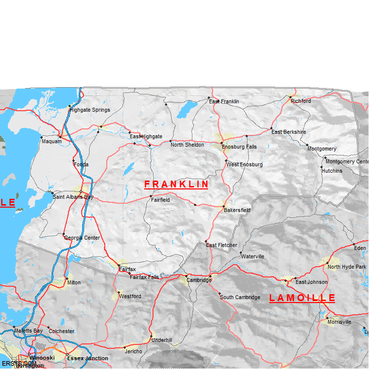 Franklin County, VT (shown in white) has 630.96 mi² of land area and 58.2 mi² of water resources. The county is bordered by: