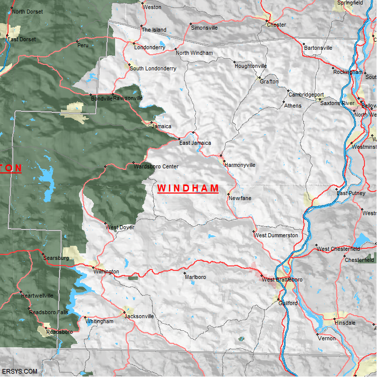 Windham County, VT (shown in white) has 785.96 mi² of land area and 12.71 mi² of water resources. The county is bordered by: