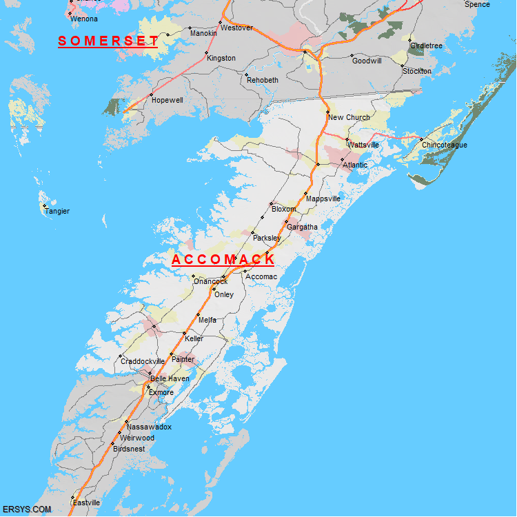 Accomack County, VA (shown in white) has 449.32 mi² of land area and 860.72 mi² of water resources. The county is bordered by: