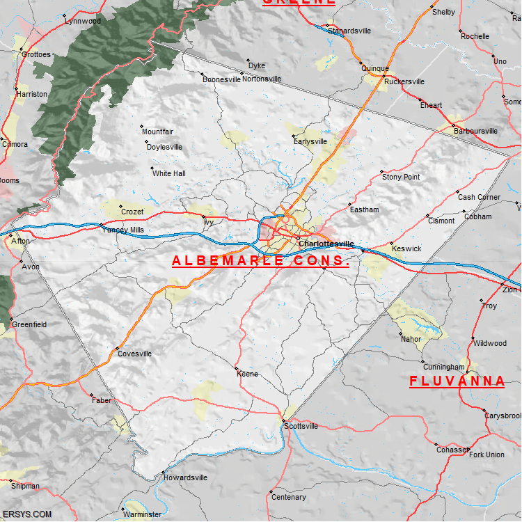 The estimated population of Albemarle County is 117,666 with 45,578 households. These households are spread across 14 unique municipalties (not all shown).
