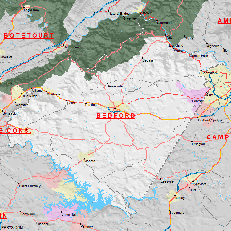 Bedford County, VA (shown in white) has 760.1 mi² of land area and 16.24 mi² of water resources. The county is bordered by: