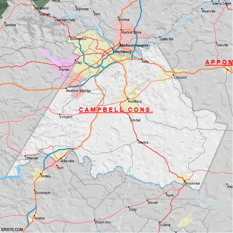 Campbell County, VA (shown in white) has 552.18 mi² of land area and 3.98 mi² of water resources. The county is bordered by: