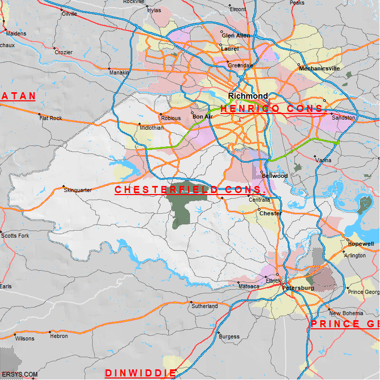 Chesterfield County, VA (shown in white) has 431.03 mi² of land area and 13.78 mi² of water resources. The county is bordered by:
