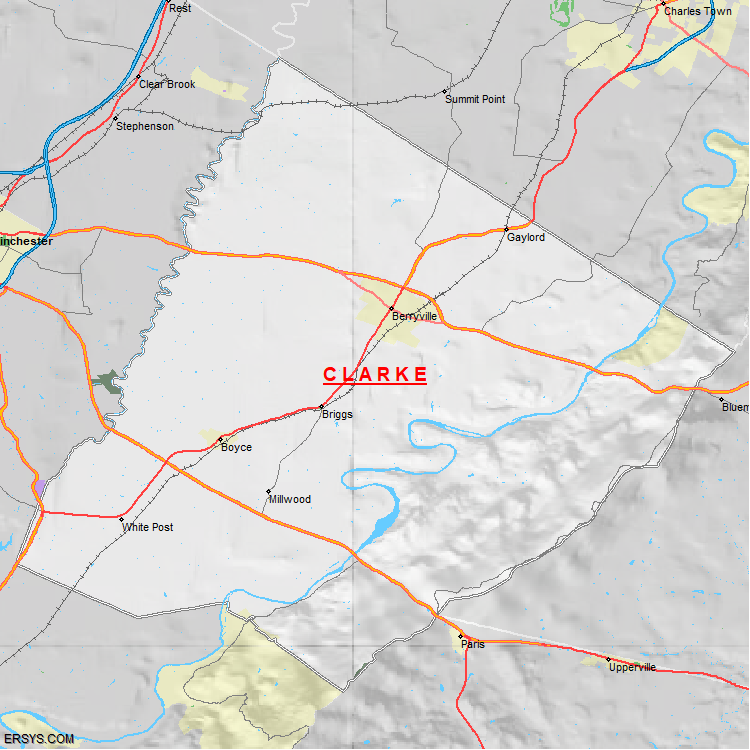 Clarke County, VA (shown in white) has 175.96 mi² of land area and 2.2 mi² of water resources. The county is bordered by: