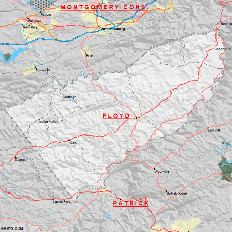 Floyd County, VA (shown in white) has 380.92 mi² of land area and 0.85 mi² of water resources. The county is bordered by: