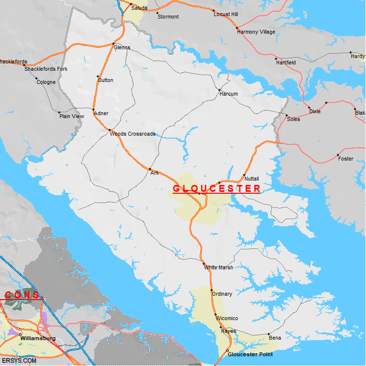 Gloucester County, VA (shown in white) has 217.81 mi² of land area and 70.17 mi² of water resources. The county is bordered by: