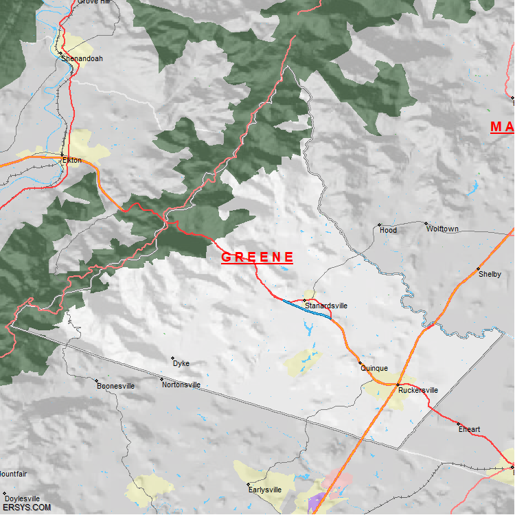 Greene County, VA (shown in white) has 155.95 mi² of land area and 0.65 mi² of water resources. The county is bordered by: