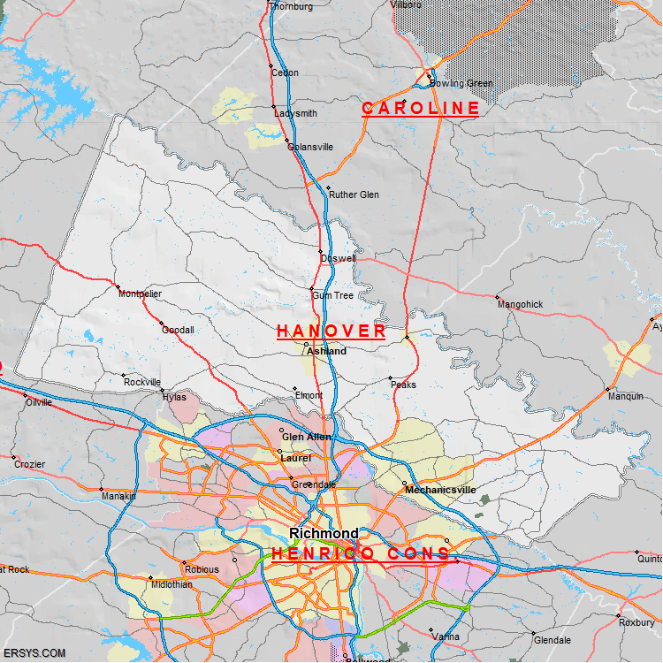 Hanover County, VA (shown in white) has 467.57 mi² of land area and 4.9 mi² of water resources. The county is bordered by: