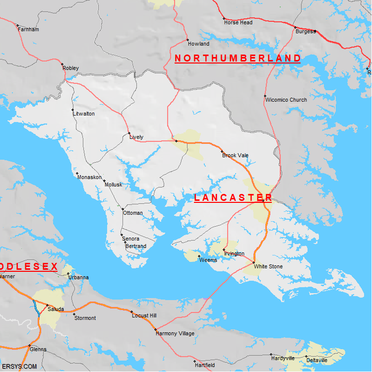 Lancaster County, VA (shown in white) has 133.31 mi² of land area and 98.11 mi² of water resources. The county is bordered by: