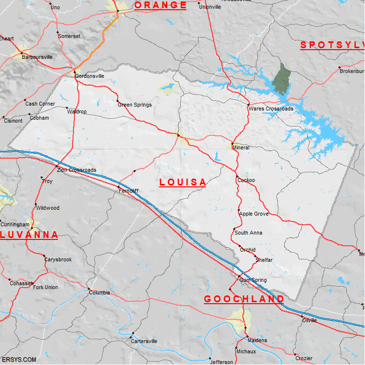 Louisa County, VA (shown in white) has 495.08 mi² of land area and 14.6 mi² of water resources. The county is bordered by: