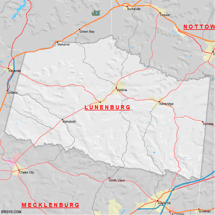 Lunenburg County, VA (shown in white) has 431.7 mi² of land area and 0.67 mi² of water resources. The county is bordered by: