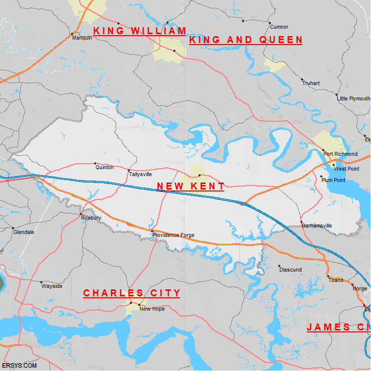 New Kent County, VA (shown in white) has 210.03 mi² of land area and 13.74 mi² of water resources. The county is bordered by: