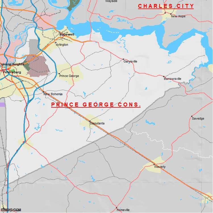 The estimated population of Prince George County is 43,655 with 12,820 households. These households are spread across 4 unique municipalties (not all shown).