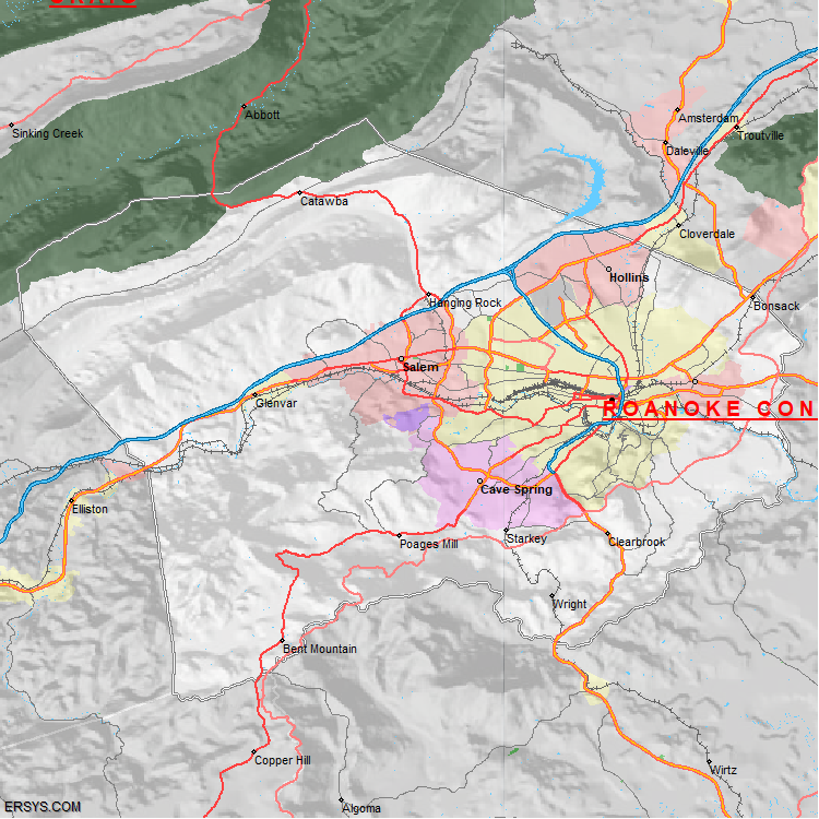 Roanoke County, VA (shown in white) has 250.55 mi² of land area and 0.68 mi² of water resources. The county is bordered by: