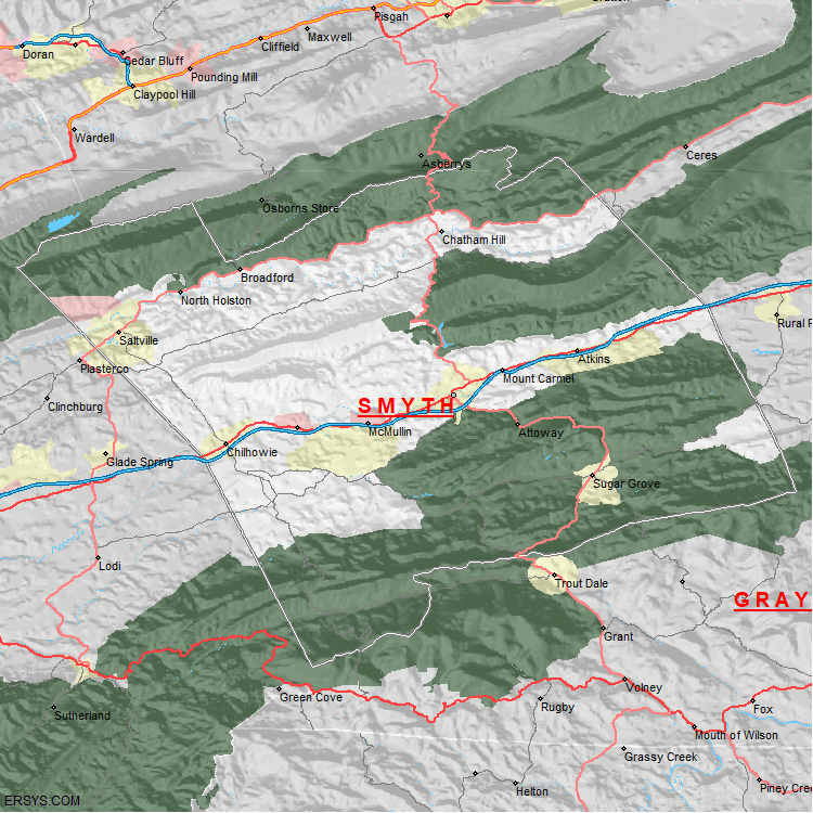 Smyth County, VA (shown in white) has 451.44 mi² of land area and 1.27 mi² of water resources. The county is bordered by: