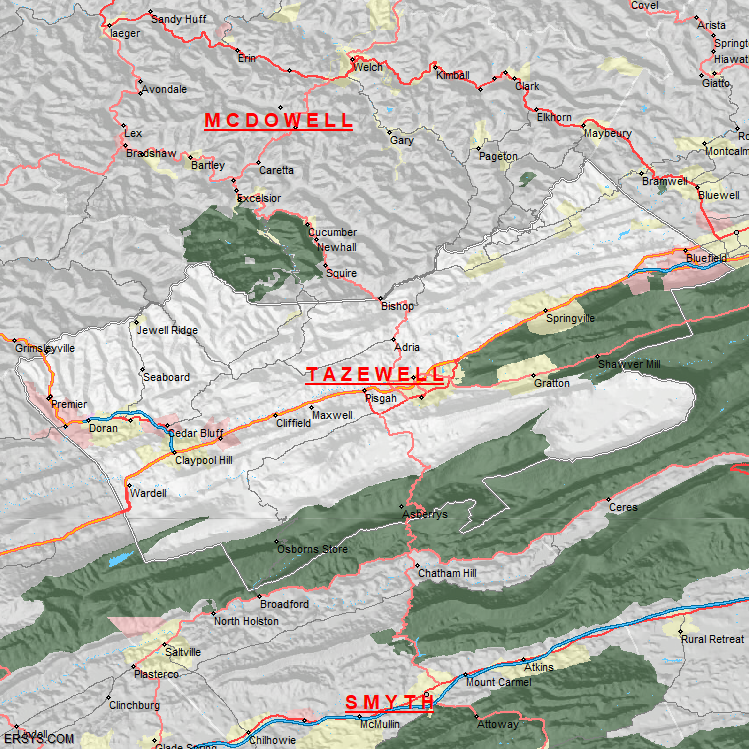 Tazewell County, VA (shown in white) has 518.79 mi² of land area and 1.13 mi² of water resources. The county is bordered by: