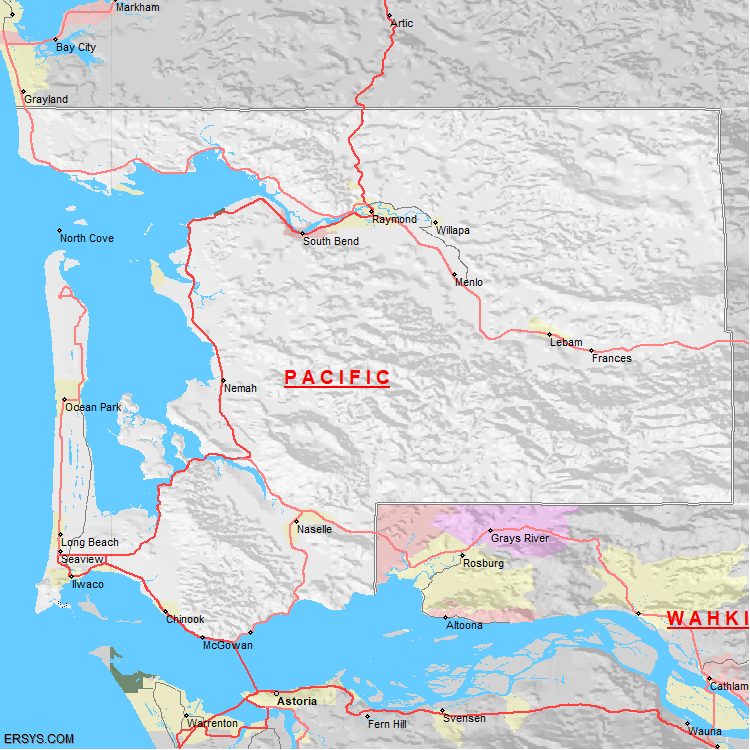 Pacific County, WA (shown in white) has 933.39 mi² of land area and 293.15 mi² of water resources. The county is bordered by: