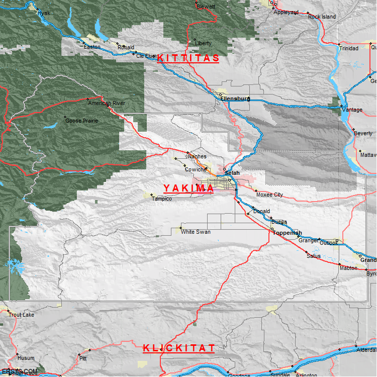 Yakima County, WA (shown in white) has 4,294.51 mi² of land area and 15.9 mi² of water resources. The county is bordered by: