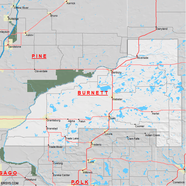 The estimated population of Burnett County is 17,300 with 7,866 households. These households are spread across 4 unique municipalties (not all shown).