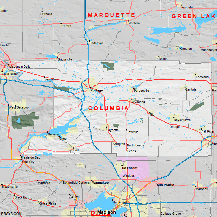 Columbia County, WI (shown in white) has 765.6 mi² of land area and 30.39 mi² of water resources. The county is bordered by:
