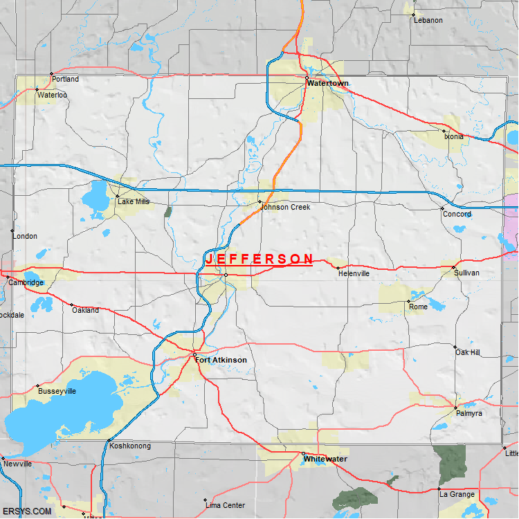 Jefferson County, WI (shown in white) has 556.49 mi² of land area and 26.25 mi² of water resources. The county is bordered by: