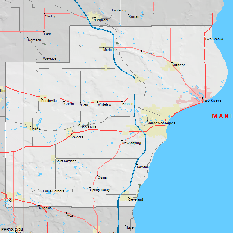 Manitowoc County, WI (shown in white) has 589.3 mi² of land area and 904.77 mi² of water resources. The county is bordered by:
