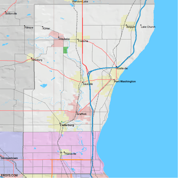 Ozaukee County, WI (shown in white) has 233.01 mi² of land area and 883.18 mi² of water resources. The county is bordered by: