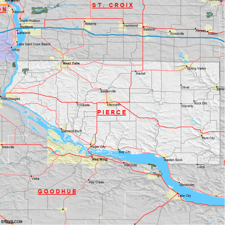 Pierce County, WI (shown in white) has 574.02 mi² of land area and 18.71 mi² of water resources. The county is bordered by: